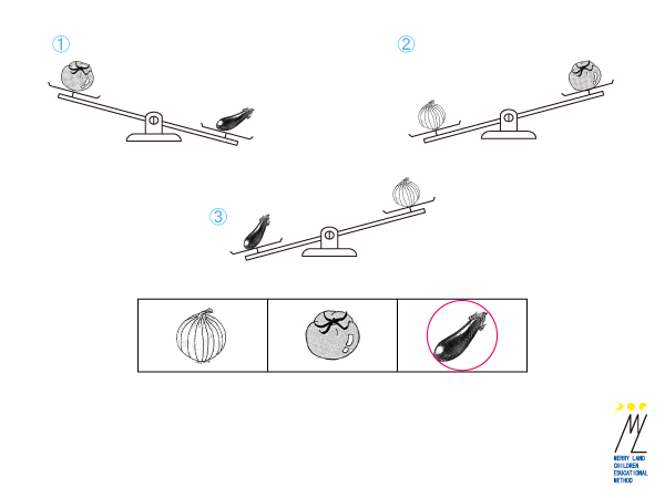 ・③では「(トマトよりも重い)タマネギよりも、ナスの方が重い」