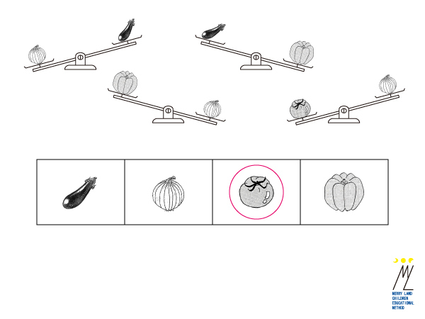 どの野菜に注目しても答えには辿り着けましたが、「重いものをさがす」問題では、天秤が下がっているものに注目すると答えを見つけやすいでしょう。