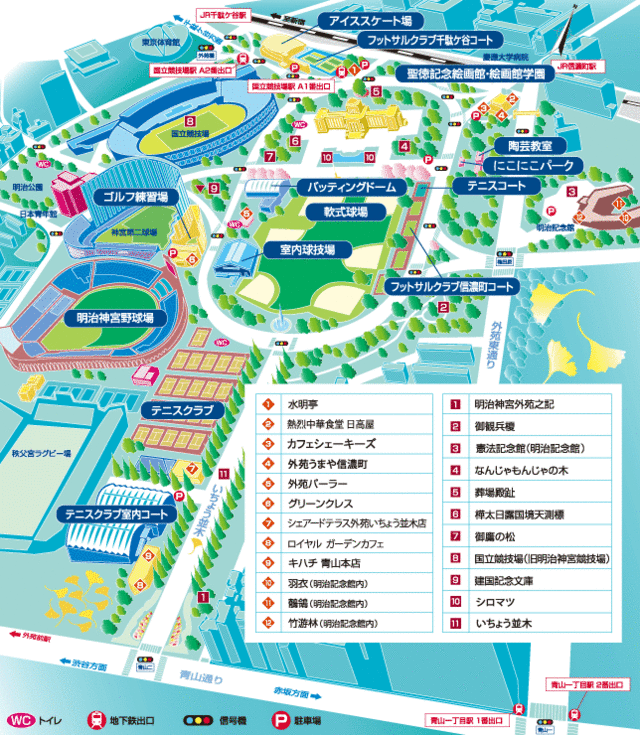 出典:www.meijijingugaien.jpにこにこパークは、JR中央・総武線「信濃町駅」から徒歩5分、東京メトロ銀座線・半蔵門線、都営大江戸線「青山一丁目駅」2番出口から徒歩10分、そして「国立競技場駅」A1出口から徒歩約6分の場所にあります。