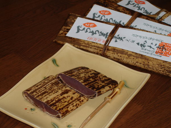 竹の皮に包まれた羊羹は薄く、竹の皮のいい香りがうつっています。