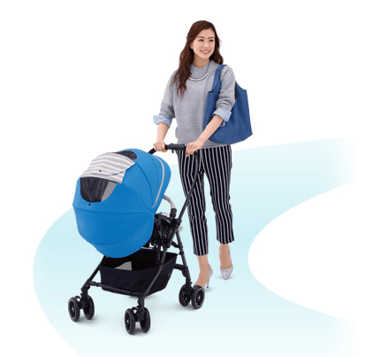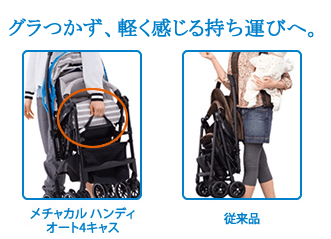 そこでコンビは、とっても軽い新しいメチャカルに「オート4キャス」を搭載し、対面式でも背面式でもいつも変わらないスムーズ走行を実現しました!