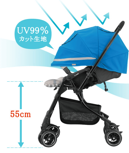 そこで、コンビの新しいメチャカルは、地熱やほこりからデリケートな赤ちゃんを遠ざける、55cmのハイシートを実現しました。