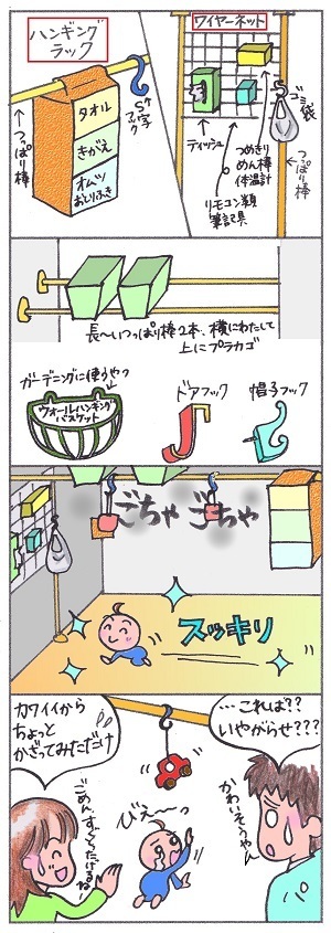 そこで、我が家では、いろんなものをつるしてみたり、つっぱったり。とにかく上へ上へと高い所へ・・・