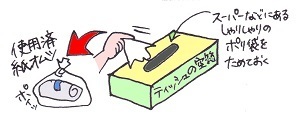 ところで、息子が抜け殻にしたティッシュ空箱に、ポリ袋を入れておいて、オムツ置き場近くに配置。使用済オムツ等を入れるのに役立つこともあり!