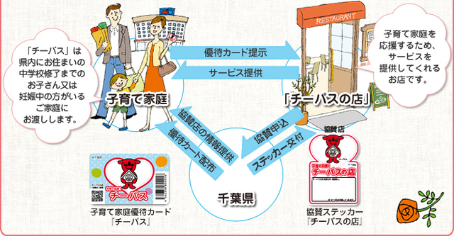 自治体は、地域の子育て中のご家族を応援してくれる協賛店を集め、サービスを提供する子育て中の家族の方達を協賛店へ誘導し、お互いに嬉しい形になってます。