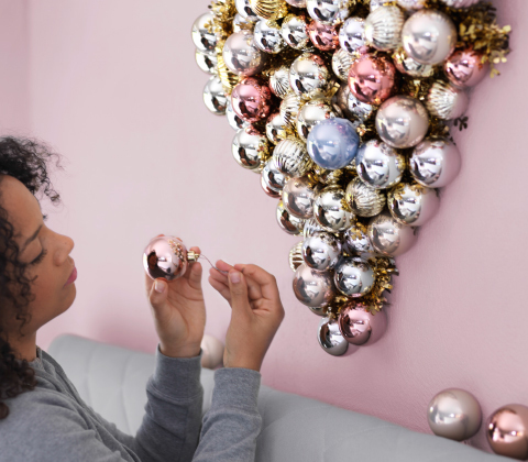 画像のようにオーナメントボールを壁に飾ったり、リボンや毛糸に通してガーランド風にしたりと、アレンジ次第でオシャレなインテリアに!
