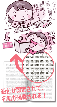 課題は審査されたのち、級位が認定されます。級位・段位の発表は誌上で行われ、子どもの名前も掲載されます。硬筆の部、毛筆の部を中心に、未就学児むけのフェルトペン課題も行われています。