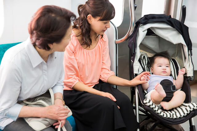 よほど力持ちで荷物運びに慣れていない限り、子どもと荷物とベビーカーを運ぶのは男性でもツラいはずです。電車で出かける時は、空いていることが大前提です。車いす・ベビーカー用のスペースがある場所でも若干肩身が狭く感じてしまいました。