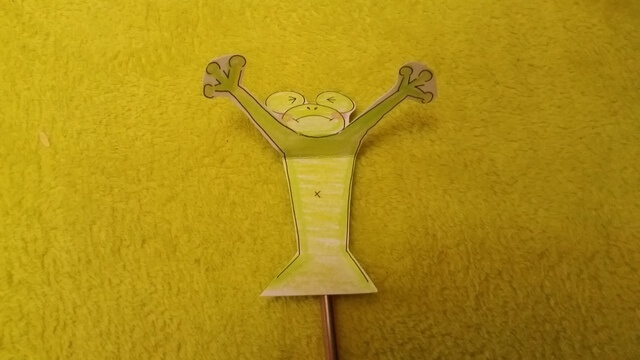 出典:オリジナル足元から出た太いストロー部分を片方の手で持ち、反対の手で細いストローを上下に動かし、「かえるさん」を「バンザイ」させましょう。