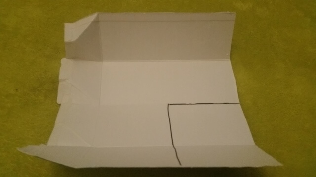 (2)牛乳パックに元々ついている折り目を活かし、画像のように黒い線の部分をカットしてください。