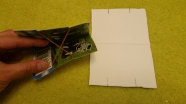 (3)切れ目に輪ゴムをかけ、牛乳パックの裏面で輪ゴムを交差させ、反対側の切れ目にかけましょう。