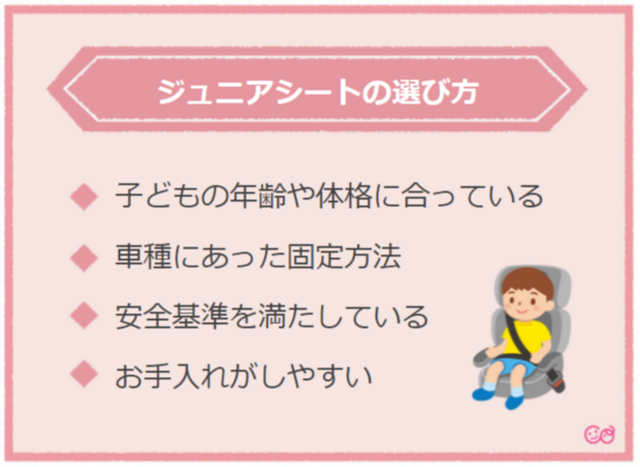 ジュニアシートを選ぶ際は、紹介した選び方を参考に、必ず年齢や体格に合った仕様のものを検討してみましょう。