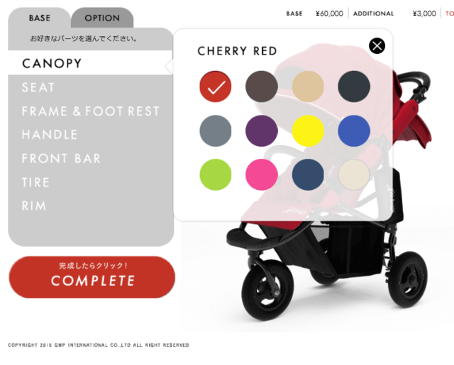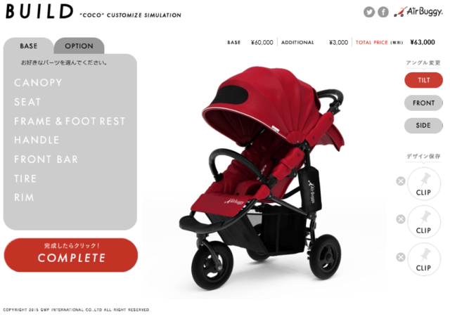 パーツを選ぶと、ページ内のバギーに反映され、アングルまで変えて見ることが出来るので完成品がとてもイメージしやすいです。