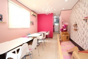 店内はピンクを基調とした女の子らしい内装で、カフェスペースは14席あります。ランチメニューは常時2種類用意されて、離乳食やキッズメニューもあります。事前に予約することをおすすめします。