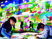 「お絵かきタウン」では自分が描いた車やビルが壁に映し出された街の映像に取り込まれ、映像の街の中を描いた絵が動きだします。