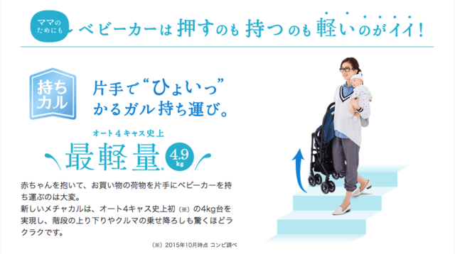出典:www.combi.co.jpメチャカル ハンディ オート4キャスは、これまでのオート4キャス史上最軽量の4.9kgの重量になっています。赤ちゃん連れのママパパはとっても大荷物ですよね。