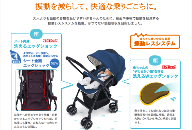 1つは、振動を受けやすい赤ちゃんのために、座面や車輪で振動を軽減する振動レスシステムを搭載しています。