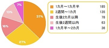 上の子がいると、生後まもなく外出の機会が多いことも。また季節がら・産後の戻りもあるのか、2ヶ月以降という方も全体の16%と、比較的多くいらっしゃいました。