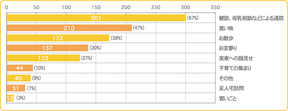 おでかけの目的は、「健診、母乳相談などによる通院」が6割以上とダントツで多い結果となりました。1ヶ月検診や母乳外来など、体調管理のために必要なおでかけですね。
