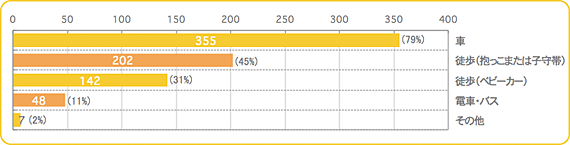 出典:www.combibaby.comおでかけの際の交通手段をお伺いしました。車でのおでかけが一番多く約8割、次に徒歩が多く、電車・バスの利用は約1割にとどまりました。