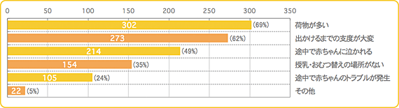 「荷物が多い」(69%)、「出かけるまでの支度が大変」(62%)、「途中で赤ちゃんに泣かれる」(49%)でした。