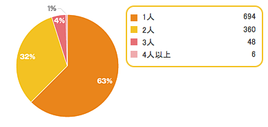 1人という方が1108名中694名、63%いらっしゃいました。2人が360名で32%、3人が48名で4%、4人以上が6名で1%となりました。