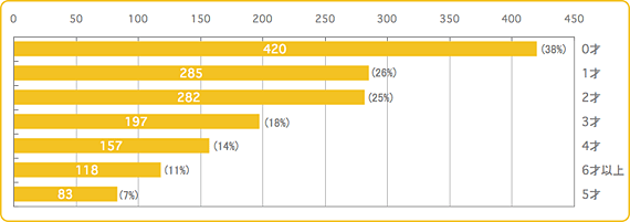 お子様の年齢をお伺いしました。0歳が最も多く38%いらっしゃいました。そして1歳(26%)、2歳(25%)、3歳(18%)、4歳(14%)と順に少なくなり、6歳以上(11%)、5歳は7%となりました。
