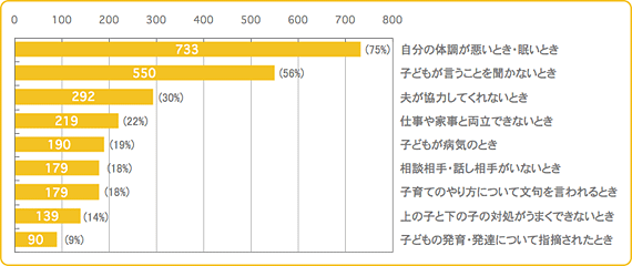 そして「仕事や家事と両立できないとき」(22%)、「子どもが病気のとき」(19%)、「相談相手・話し相手がいないとき」(18%)、「子育てのやり方について文句を言われるとき」(18%)、「上の子と下の子の対処がうまくできないとき」(14%)、「子どもの発育・発達について指摘されたとき」(9%)と続きました。