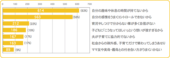 そして、「育児やしつけで分からないことが多く自信がない」(22%)、「子どもにこうなってほしいという想いが強すぎるから」(19%)、「夫が子育てに協力的でないから」(17%)、「社会からの疎外感、子育てだけで終わってしまうあせり」(17%)、「ママ友や実母・義母との付き合いがうまくいかない」(9%)と続きました。