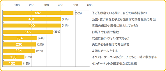 そして、「お菓子やお酒で発散」(35%)、「友達に会いに行く・来てもらう」(24%)、「夫に子どもを預けて外出する」(24%)、「友達にメールをする」(23%)、「イベント・サークルなどに、子どもと一緒に参加する」(15%)、「インターネットの掲示板などに投稿」(13%)と続きました。