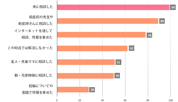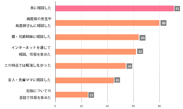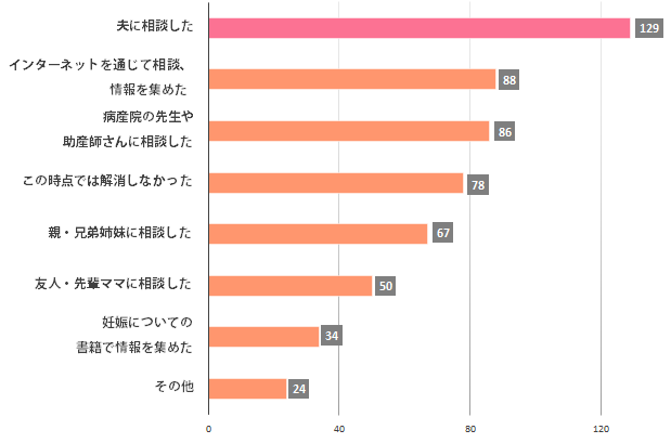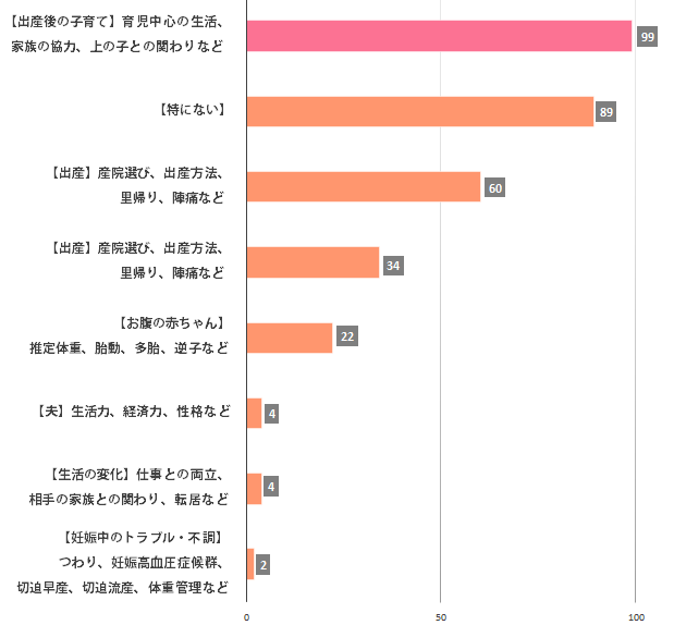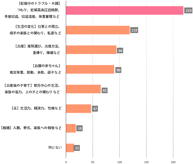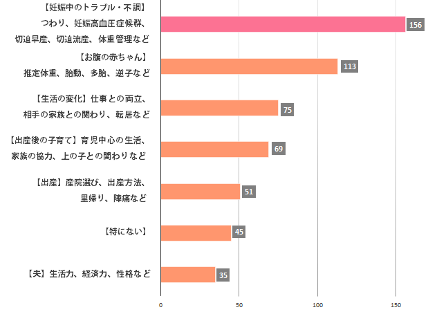 また、「特にない」という方が、妊娠中期・後期に比べて最も少ないことから、妊娠初期というのは、あれこれ不安に思ってしまう時期だということがわかります。