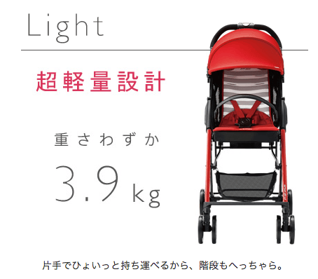 出典:www.combi.co.jp何かと荷物が多くなってしまうママパパにとって、うれしいポイントは「軽さ」です。なんと、わずか3.9kgの超軽量設計。