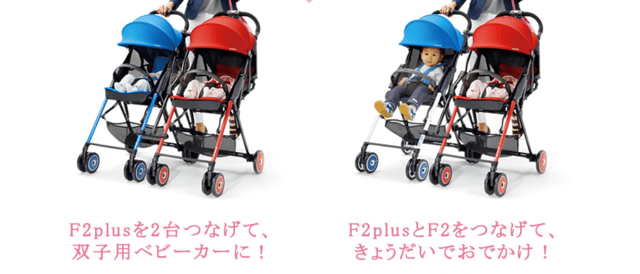 出典:www.combi.co.jpコンビ「F2シリーズ」は、別売りの専用ジョイントパーツを使うと横並びに2台つなげることができます。双子の赤ちゃんの場合や、兄弟姉妹で同時にベビーカーを使いたい時などとても便利な機能です!
