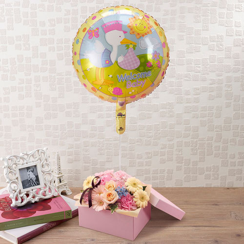 出典:www.hibiyakadan.comこちらは、「WelcomeBaby」と書かれたかわいらしいバルーンと生花のセットです。箱を開けるとフワーッと浮かび上がるバルーンにビックリ!