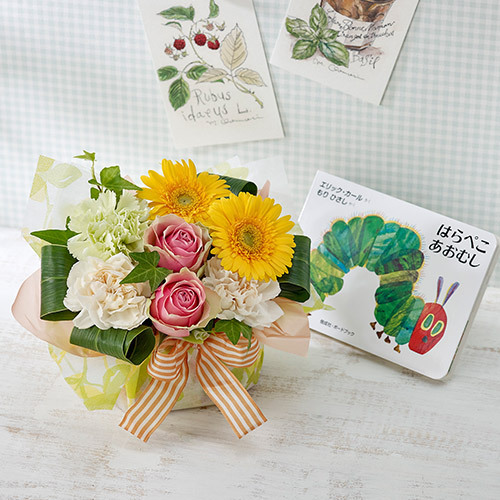 出典:www.hibiyakadan.comこちらは子どもに大人気の絵本『はらぺこあおむし』とフラワーアレンジメントのセットです。青虫が蝶に成長していく話は、出産祝いの花に添えるのにピッタリな内容。親子一緒に絵本を楽しめる日が来るのが待ち遠しいですね。