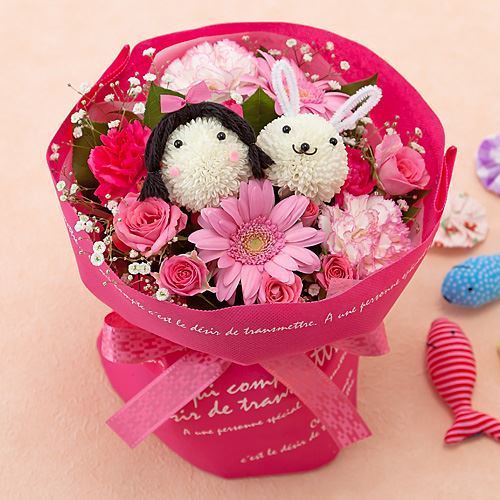ウサギと女の子の顔カタチをしたピンポンマム(菊の一種)がとってもかわいくほっこり温かい気持ちになります。他にも男の子とクマをモチーフにした男の子向けアレンジメントもありますよ!メッセージカードも付けられます。
