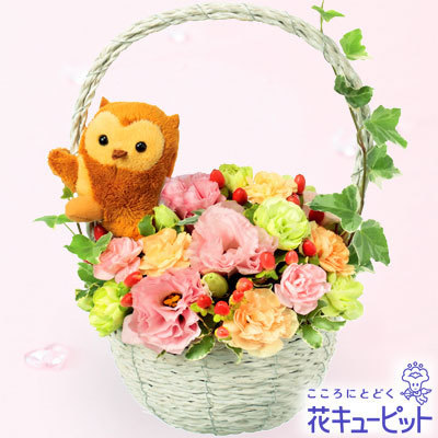 【6】ふくろうのマスコット付きアレンジメント|花キューピッド