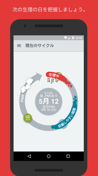 出典:play.google.comおしゃれで実用的なアプリをお探しの方におすすめなのは、Clue。生理から排卵、そして次の生理へ、という生理周期を1つの円で表示してくれるため、いまどの時期にあたるか一目でわかります。また、生理日や妊娠しやすい日のほかにも、月経前症候群(PMS)の日などを通知してくれます。