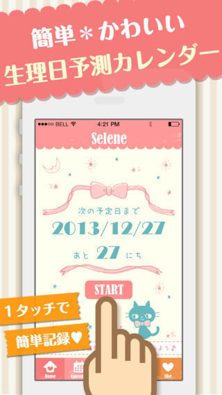使い方は簡単で、生理がきたら記録ボタンをタップするだけ。トップ画面で生理日までの日数をカウントダウンしてくれたり、生理日が近くなるとトップ画面に記録ボタンを表示してくれたりと、記録し忘れることがありません。
