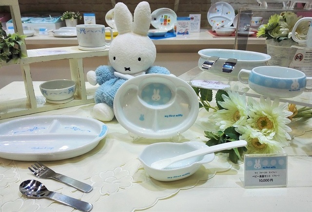 もう一つ、取材班が足を止めたのは「ミッフィーのベビー食器シリーズ」。写真のブルーベースの他に、ピンクベースもあり男女問わず使えます。シンプルなミッフィーデザインが上品!