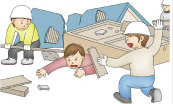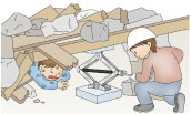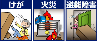 大地震では、テレビや、タンスなどが不意に落ちたり倒れてきます。倒れた家具が出入口を塞ぎ、割れたガラス等が逃げ道を阻みます。さらに、家具や本棚の中にある本などがストーブなどに転倒・落下して出火する危険もあります。