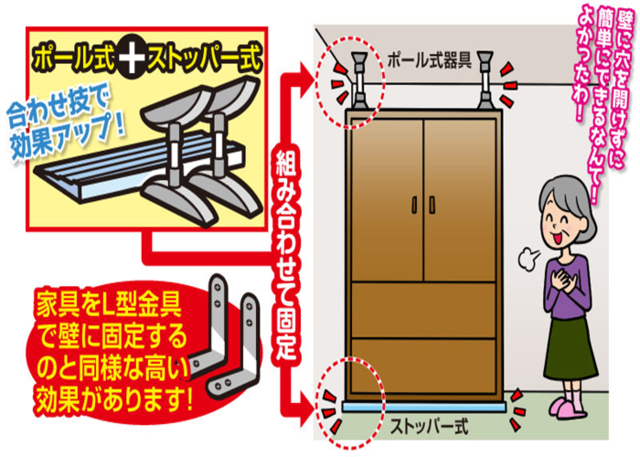 例えば、ストッパー式器具とポール式器具の併用によりL型金具のネジ固定と同様な高い効果が得られます。また、家具の配置も重要です。通路や出入口付近、寝室にはできるだけ家具類を置かないようにするとともに、もし置く場合には、家具の向きにも注意しましょう。