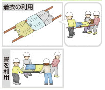 □物干し竿2本とトレーナーなど4~5枚で応急的な担架が作れます。