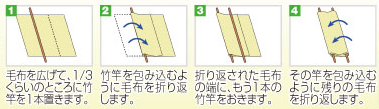 毛布1枚と竹竿(丈夫な物干し竿)2本で応急的な担架が作れます。