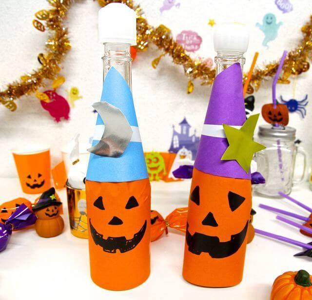 空き瓶を使ったカラフルなジャック・オー・ランタンです。