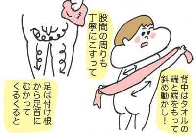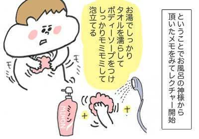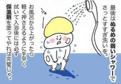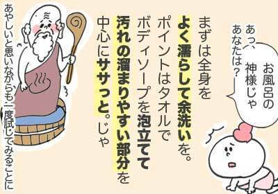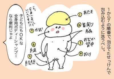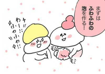 まずは全身をよーくぬらして、ふわふわの泡でささっとやさしく洗う。これがコツです。