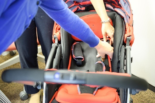 ベビーカーのシートを触る女性,