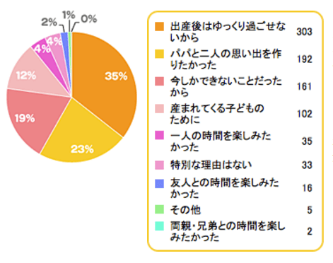 3割以上の方が「出産後はゆっくり過ごせないから」(35%)とのことでした。生活がまるっきり変わってしまうことへの不安もありながら、「パパと二人の思い出を作りたかった」(23%)という方や、「今しかできないことだから」(19%)と妊婦生活を楽しむ姿勢が見られます。