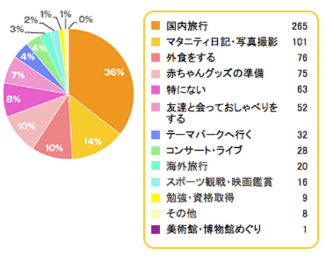 トップ3は「外食をする」(65%)、「赤ちゃんグッズの準備」(63%)、「国内旅行」(63%)となりました。外食と旅行は、出産後に行ける場所は限られてしまうもの。