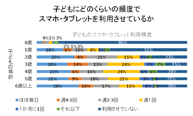 未就学児にスマホ・タブレットを利用させる頻度を調査したところ、週1回以上利用する割合は「0歳」で11%、「1歳」で41%、2歳以降は約7割であることがわかりました。
